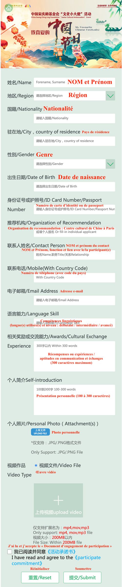 Il est recommandé d’enregistrer les vidéos dans l’une des langues de travail des Nations Unies : chinois, anglais, français, russe, arabe ou espagnol. Les jeunes hors de Chine sont encouragés à utiliser le chinois, les jeunes de Chine continentale, Hong Kong, Macao et Taiwan sont encouragés à effectuer l’enregistrement dans la langue d’un autre pays ; les candidatures répondant à ces critères se verront attribuer des points supplémentaires lors de la sélection.