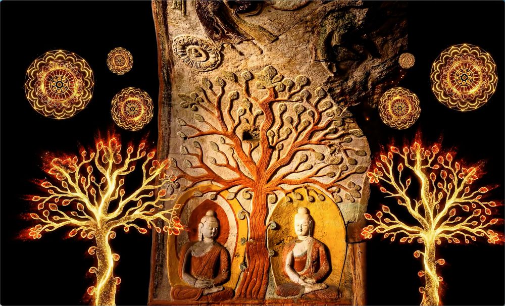 - 菩提树于立柱间生长,象征文明的交融与新生。